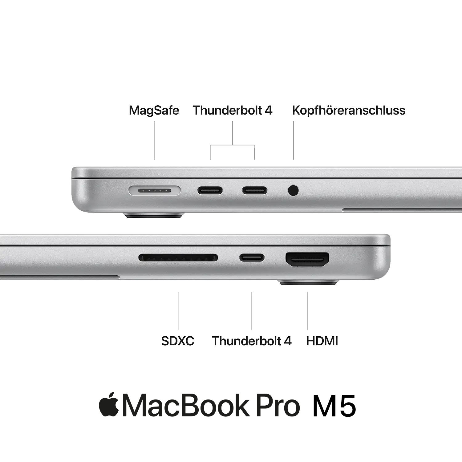 SDXC Kartensteckplatz HDMI Anschluss 3,5 mm Kopfhöreranschluss MagSafe 3 Anschluss Drei Thunderbolt 5 (USB‑C) Anschlüsse |